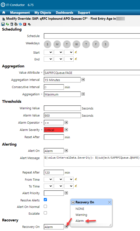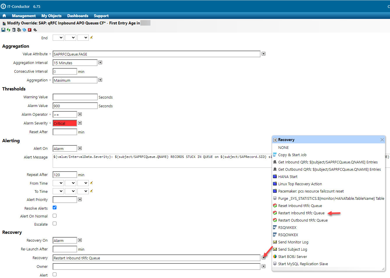 5\. Select the desired recovery action in the **Recovery** dropdown menu.