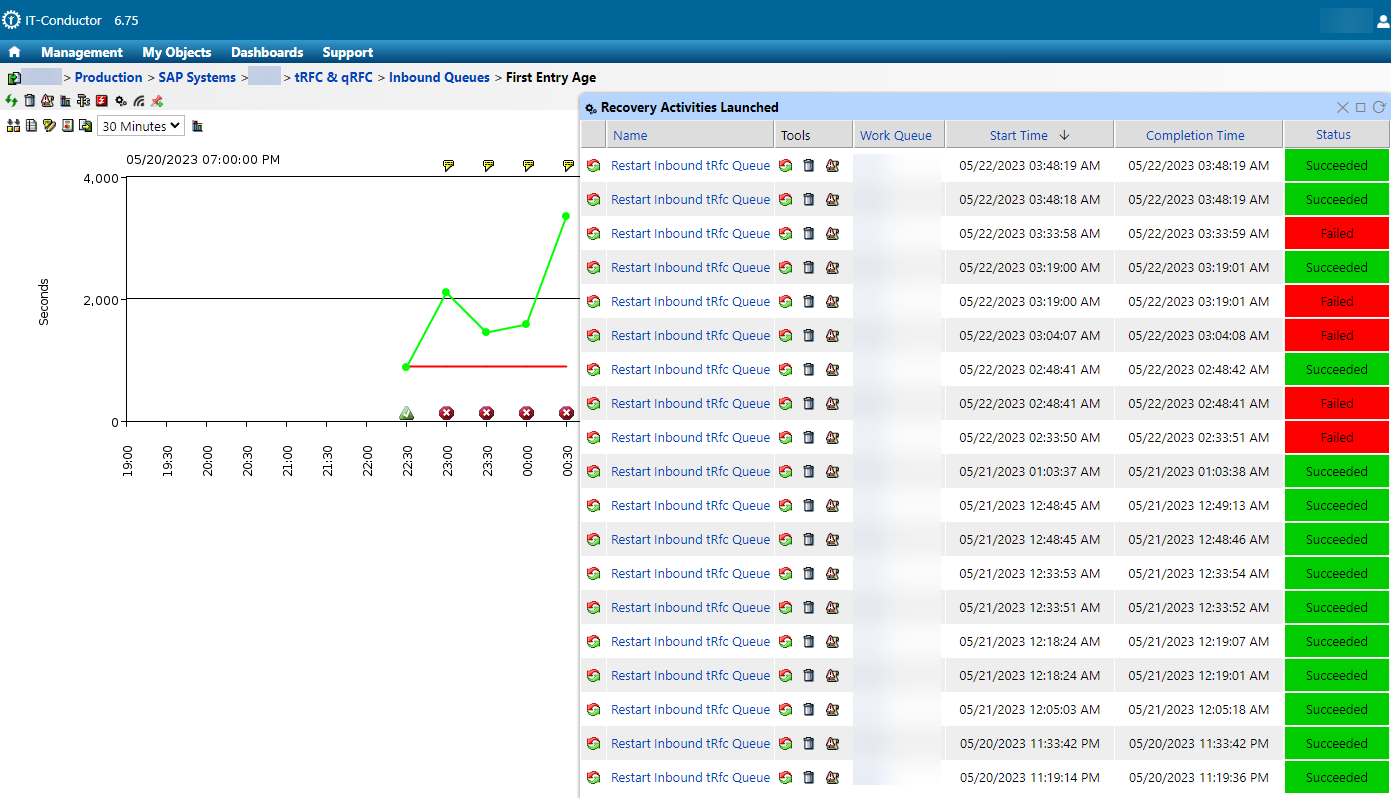 IT-Conductor allows users to automate the restarting of Inbound/Outbound (SYSFAIL, RETRY, CPIERR, and RUNNING) queues. It can be applied to one or more systems and can be run manually or on a schedule. This feature is highly adaptable to any customer environment and can become essential to IT maintenance operations.