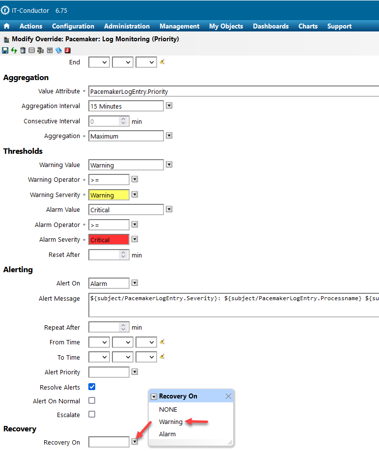 5. Select the desired recovery action in the **Recovery** dropdown menu.