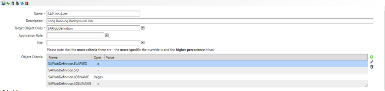 7. Set the threshold values and the alert message that will be displayed whenever the job elapsed time goes over the defined threshold. The message will display the objects selected in the object criteria section.