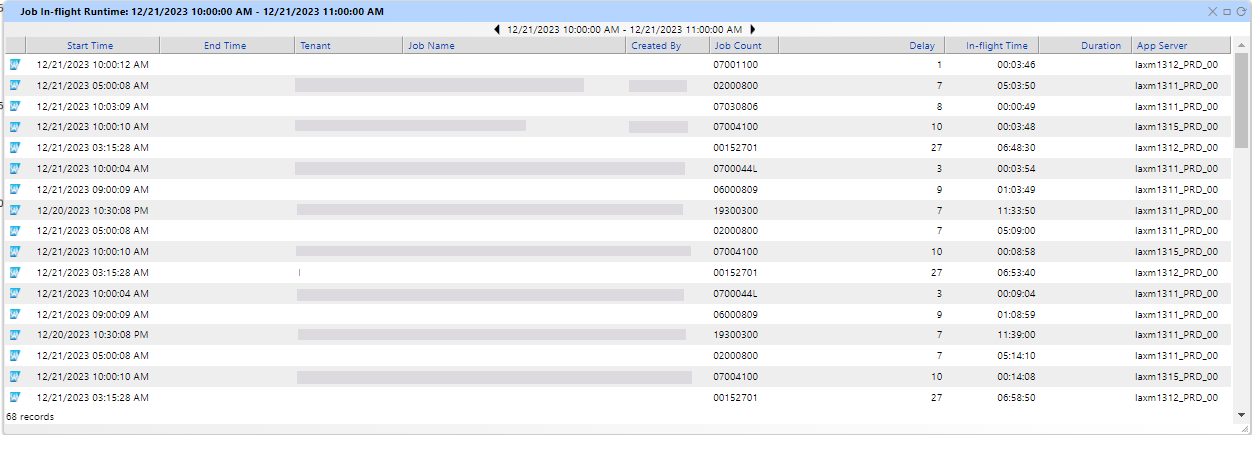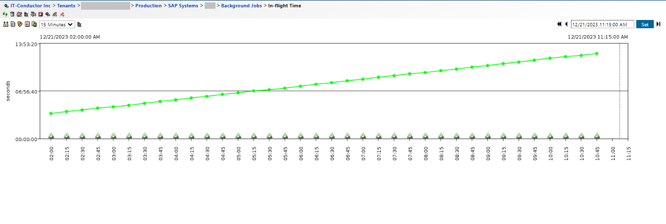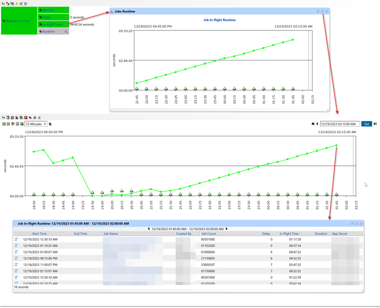 Utilizing IT-Conductor to monitor In-Flight Time ensures the efficient use of resources and timely completion of tasks. The chart below provides a visual representation. By clicking on a data point, a pop-up window displays a list of jobs and their respective In-Flight times. This view can be expanded, and the time and other attributes can be sorted as required for detailed analysis.
