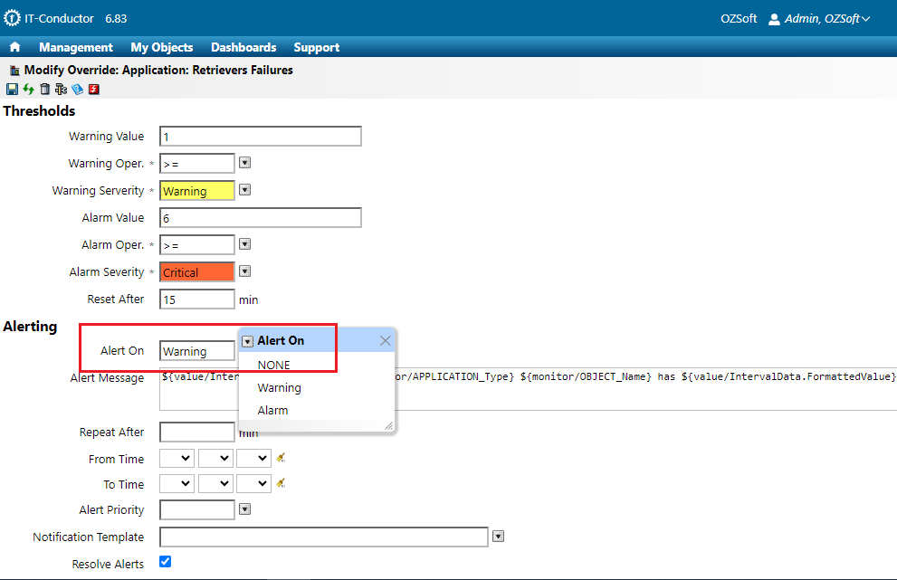 5. In the **Alerting** section, set the **Alert On** field based on severity (None, Warning, and Alarm).