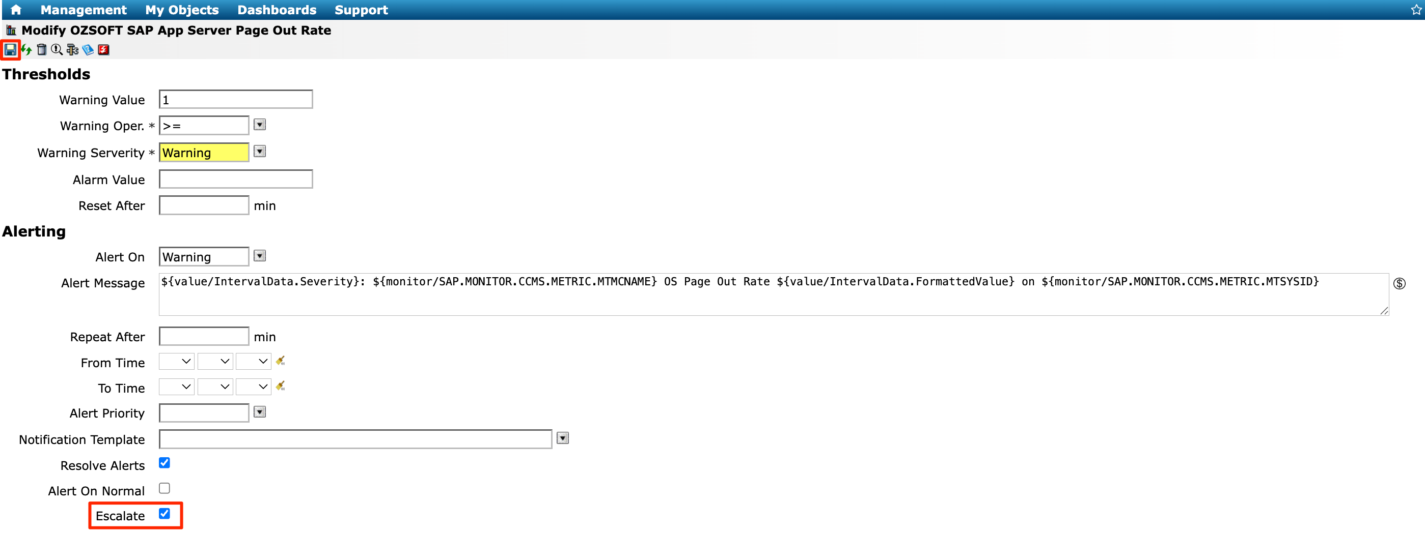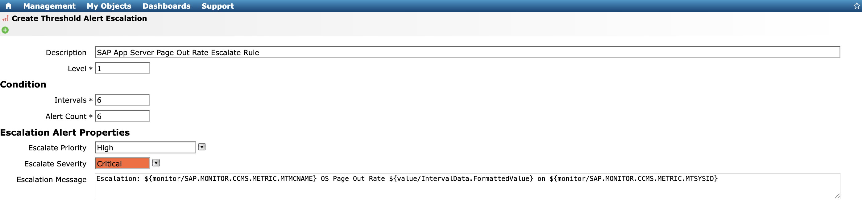 * **Escalate Severity** – refers to the severity level set for the escalation alert.