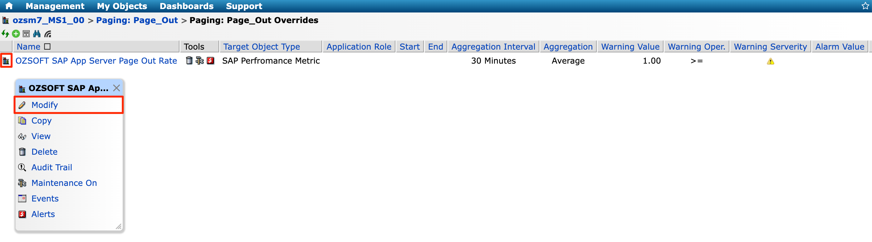 2. Select the threshold override you want to modify, click <img src="https://377464071-files.gitbook.io/~/files/v0/b/gitbook-x-prod.appspot.com/o/spaces%2FXhp08OmU8050PePmMgDt%2Fuploads%2FbrOs2LgoCZkn2KqyAzJe%2Fthresholds-icon.png?alt=media&#x26;token=c01242d8-2d2e-473a-a805-94469eb794d9" alt="" data-size="line">**Threshold Default Settings**, then select <img src="https://377464071-files.gitbook.io/~/files/v0/b/gitbook-x-prod.appspot.com/o/spaces%2FXhp08OmU8050PePmMgDt%2Fuploads%2FuHYv3MBa7TEUIc3aL73C%2Fchange-icon.gif?alt=media&#x26;token=efe10078-139b-4865-a615-2917930d3861" alt="" data-size="line"> **Modify.**