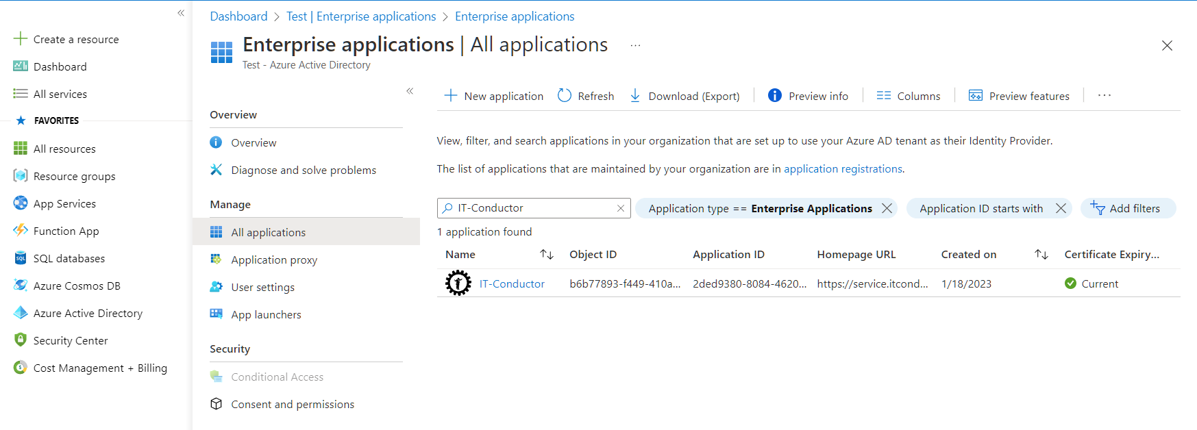 <figure><img src="https://377464071-files.gitbook.io/~/files/v0/b/gitbook-x-prod.appspot.com/o/spaces%2FXhp08OmU8050PePmMgDt%2Fuploads%2F5PwIY2KHkDjlxPJ4TV9S%2FAzure-list-ITC.png?alt=media&#x26;token=27f42e16-e034-46c0-ab2b-cc999ba953ee" alt=""><figcaption><p>Figure 2: Enterprise Applications in Azure Portal</p></figcaption></figure>
